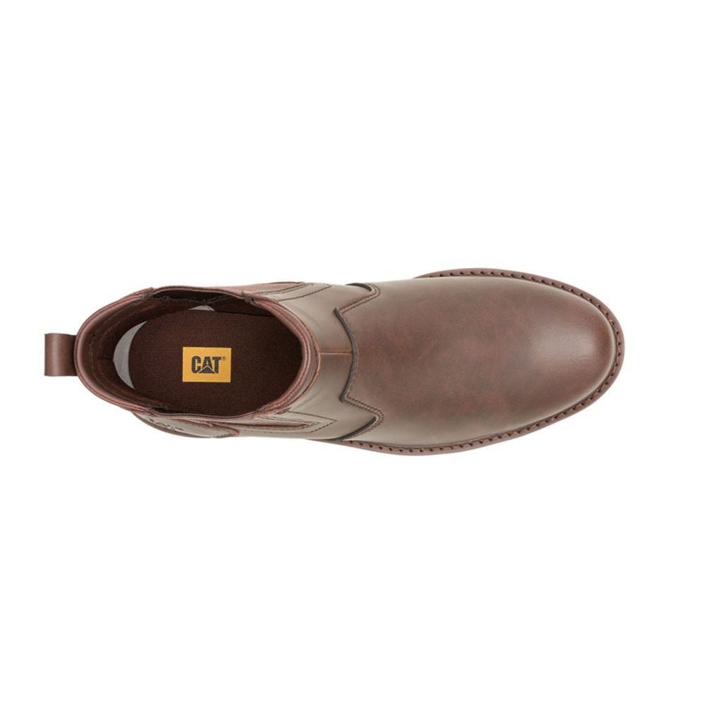 The Staten Chelsea Dark Brown boots are part of Caterpillar’s collection, known for durable construction and sleek Chelsea boot design with stretch side panels for easy on and off