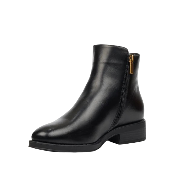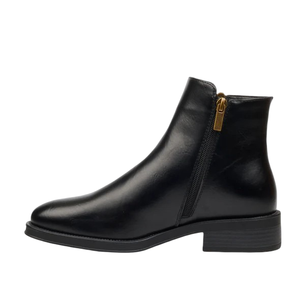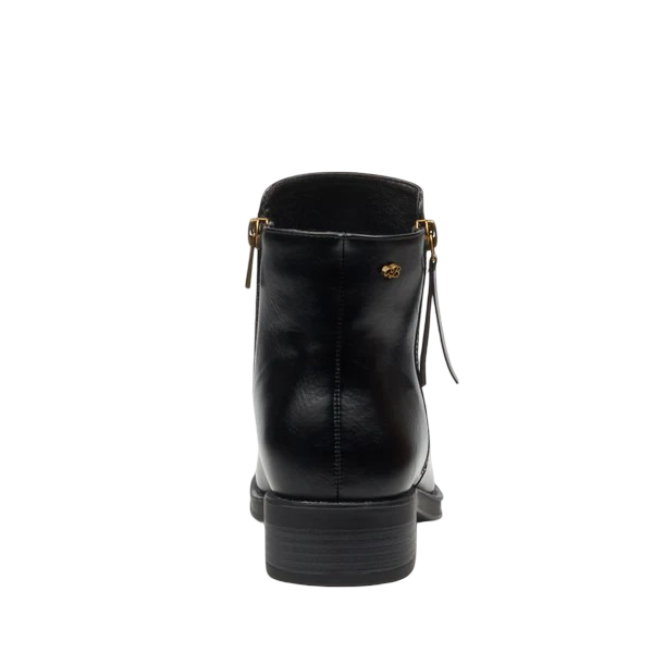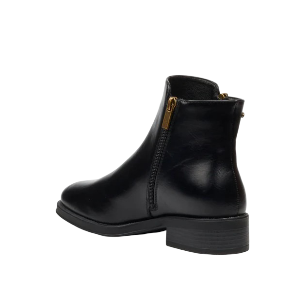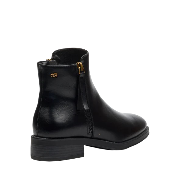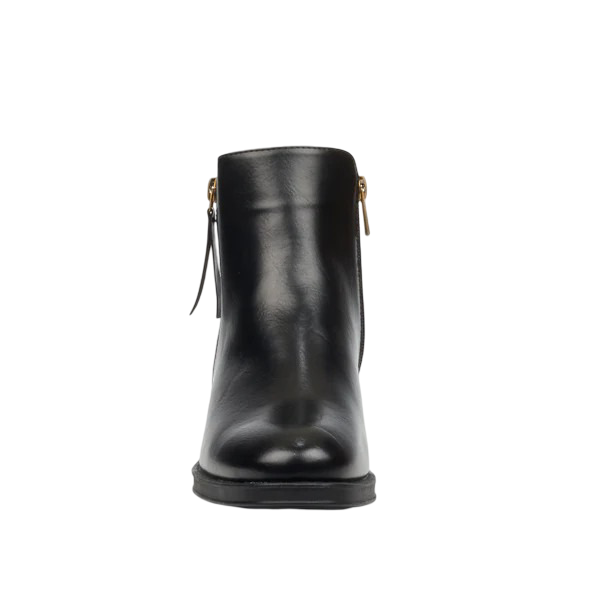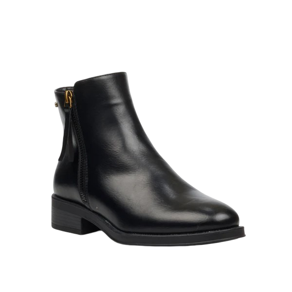 This chic ankle boot in rich black delivers timeless sophistication with a contemporary twist. Featuring a smooth finish, side zip closure and tassel detail, it offers effortless style and practicality. The low stacked heel provides comfortable lift, making it an easy choice for both work and weekend wear.