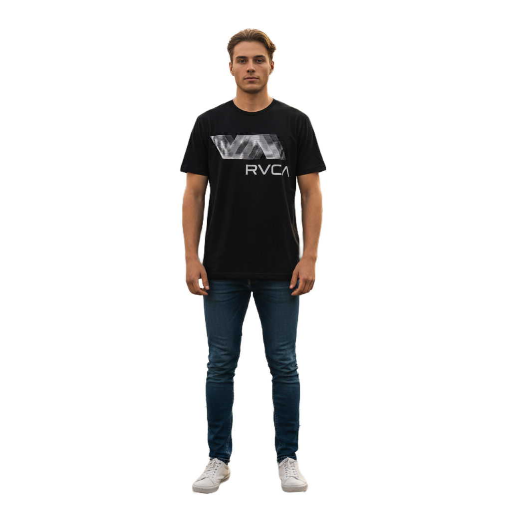 The RVCA VA Blur T-Shirt in Black (SKU: 01370) is a great choice! It features custom logo screen prints on the front and back, and is made from poly-cotton fabric treated with DriRelease® for moisture-wicking and odor-control properties. The tee has a crew neckline, short sleeves, and a regular fit for comfort.
