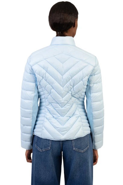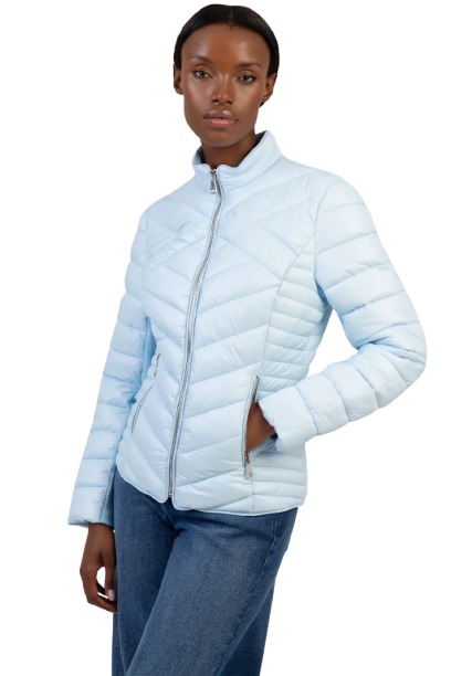 The Ravilla Puffer Jacket is a light blue quilted outerwear piece designed with a zip-up front, long sleeves, and functional side pockets. It features a stand collar for added coverage and subtle brand detailing on the sleeve. Cut to a fitted silhouette, the jacket is finished with a structured quilted design that creates a clean, streamlined look for everyday wear.