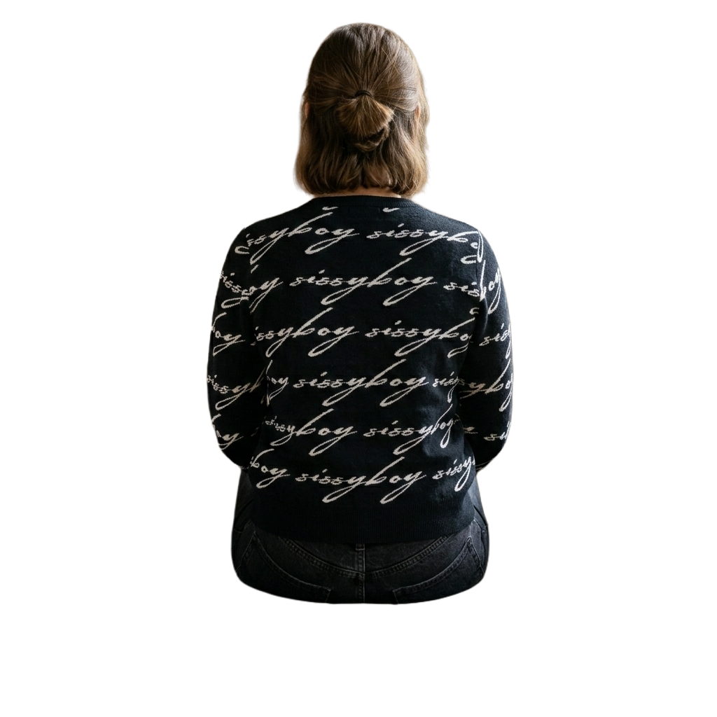 The SISSYBOY/SWEATER OFF BLACK WHITE T31919, also known as the Chelsea or Contrasted Logo Knit Sweater, is available in black and off-white, features the iconic Sissy Boy logo, and can be purchased online in South Africa starting from approximately R749.99.