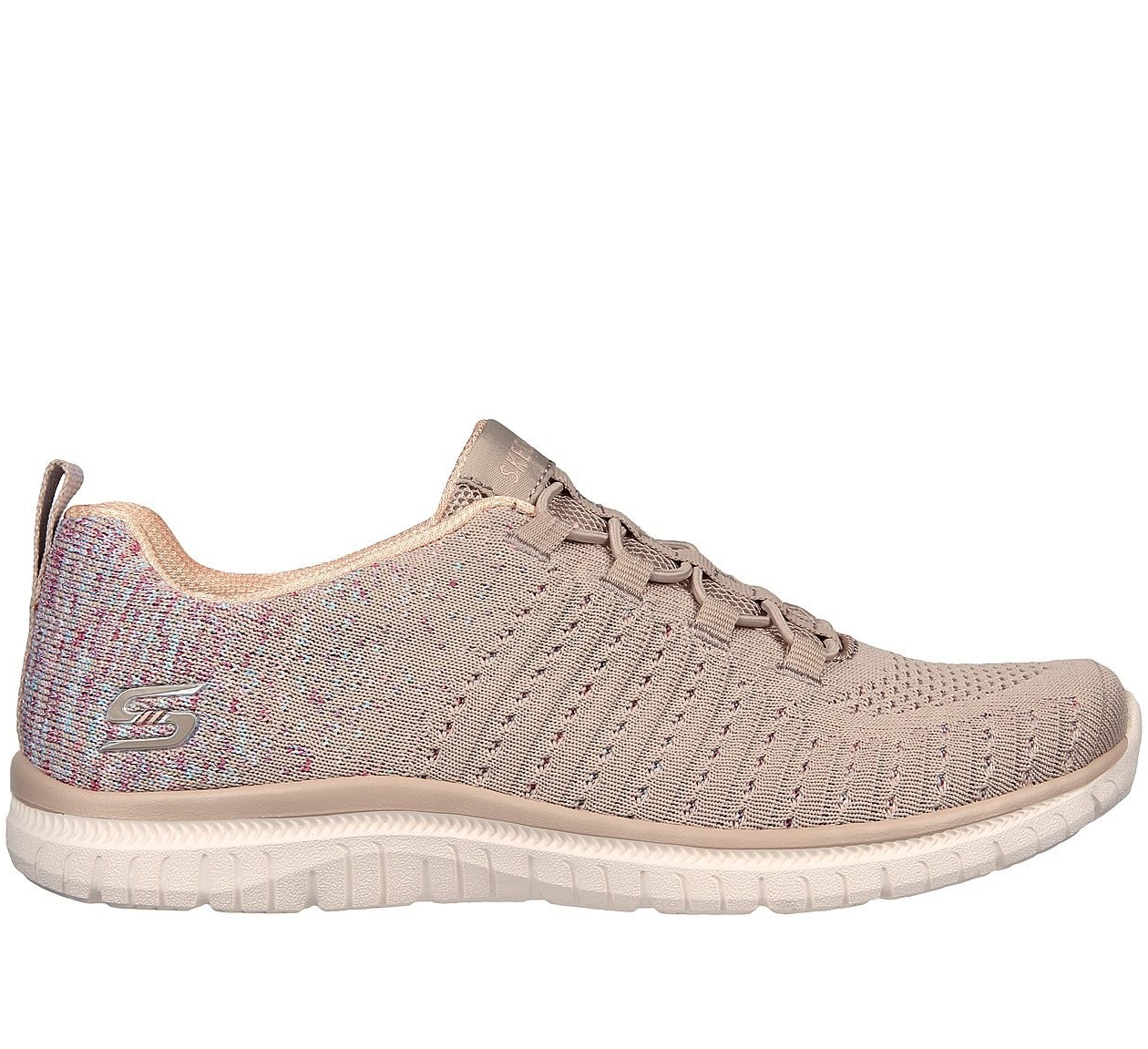 The Skechers Virtue in Taupe/Pink (104411) is a stylish and comfortable sneaker! These shoes feature an engineered mesh upper with a cushioned Skechers Memory Foam insole for all-day comfort. They also have a lightweight shock-absorbing midsole and a flexible traction outsole for added support and durability. The taupe and pink color combination adds a trendy touch, making them perfect for casual wear.