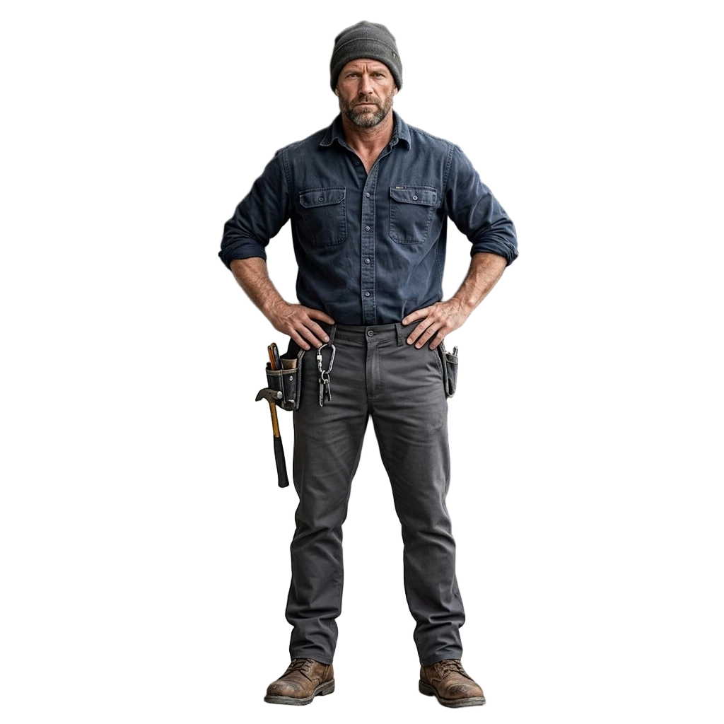 These are a “rugged-refined” hybrid. While they function as work pants (as evidenced by the hammer loop and tool pouches in the photo), the clean silhouette allows them to transition easily into a casual everyday look when paired with a flannel or denim shirt.