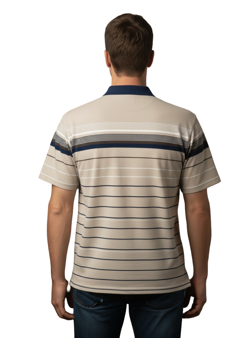 A clean, classic golf tee with a khaki body and navy accents, designed for on-course performance and casual clubhouse wear; pairs easily with chinos or golf shorts and works as a versatile seasonal staple.
