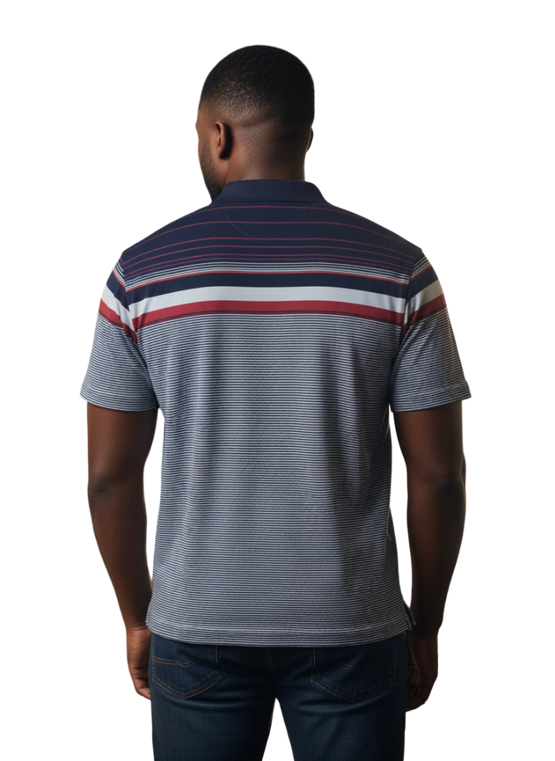 A men’s everyday striped golf polo in navy, white, and red, listed under style code 9096870 as part of Sterling’s casual/golf collection