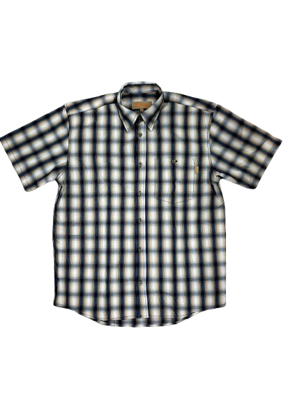 The Sterling Check Shirt in Khaki, White, and Navy (model 3193009 07) is a high-quality, durable, short-sleeve shirt featuring a single pocket, suitable for casual and outdoor wear.