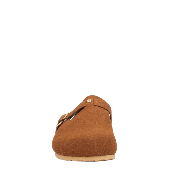 The VIA BEACH/QORK 12 BROWN is a stylish, comfortable women’s shoe with a brown faux leather upper, slip-on mule design, and a 2 cm slingback heel, perfect for casual wear or light adventures.