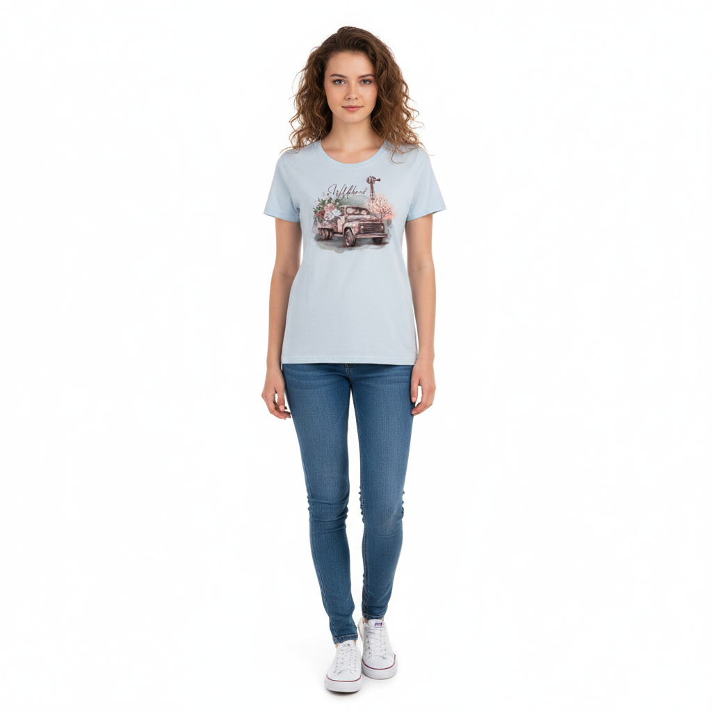 The Wildebees Women’s Driving Miss Daisy Tee in Fog (WLA084) is a charming and stylish addition to your casual wardrobe. Here are some key features: